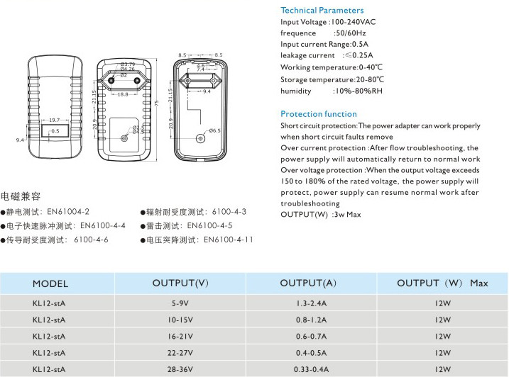頻率:50/60Hz 輸入電流:0.5A 漏電電流:≤0.25A 工作溫度:0-40℃ 貯藏溫度:-20-80℃ 濕度:10%-80%RH 短路保護(hù): 電源適配器在短路解除時(shí)能正常工作恢復(fù) 過流保護(hù):過流故障排除后,電源將自動恢復(fù)正常工作 過壓保護(hù):當(dāng)輸出電壓超過額定電壓的150-180%時(shí),電源將保護(hù),故障排除后電源能恢復(fù)正常工作" />